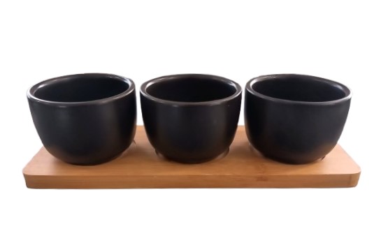 Mustad kausid 3 tk Ø4.5×6.5cm 70ml. Puidust alus 7.5×21.5cm