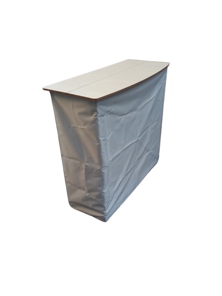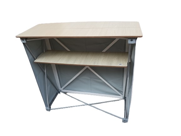 Kokkupandav esitluslaud. Ees takjakinnitusega hall kate. 1 lisariiul asjade hoidmiseks lauaplaadi all.