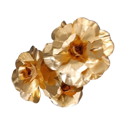 Kuldsete kunstlillede komplekt variant buffe lauale. Komplektis alus (valge),kuldsed varred lehtedega ja 3 õit. Varte pikkused 25/45/65cm. Varsi saab painutada ja suunata kuhu poole meeldib.